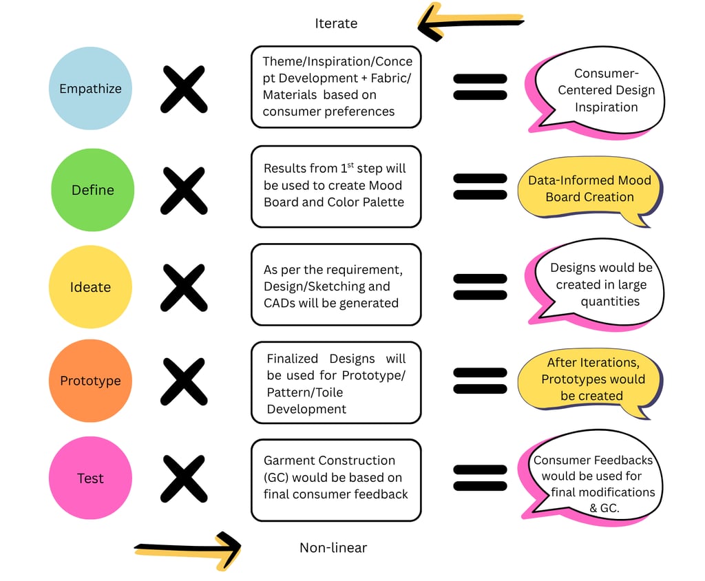 Here, the seven specific steps of traditional design development in the discipline of fashion are considered as: (1) Theme, Inspiration, and Concept Development, (2) Mood Board Creation, (3) Color Palette, (4) Design/Sketching and CAD, (5) Fabric and Material Research, (6) Prototype/Pattern/Toile Development, and (7) Garment Construction.
