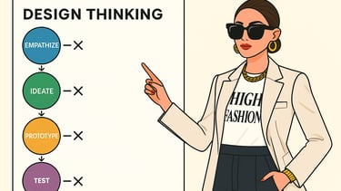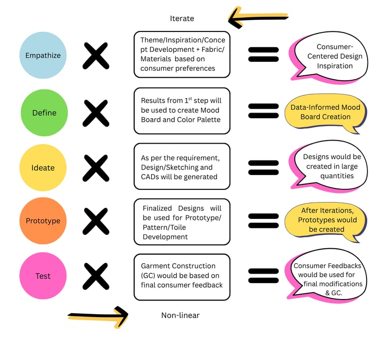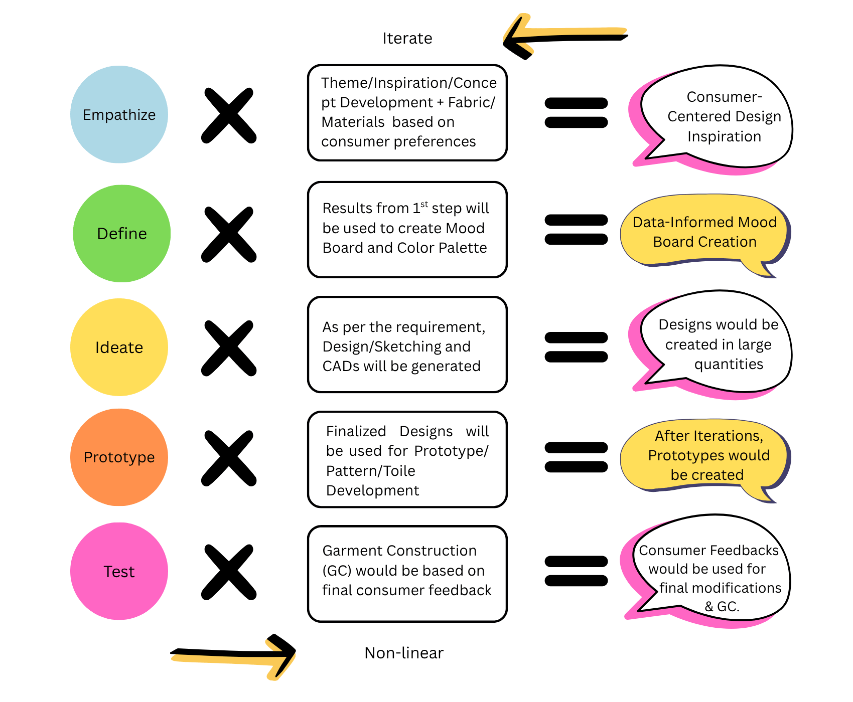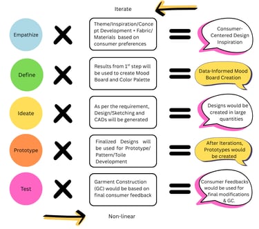 Design Thinking could be valuable for Haute Couture and Avant Garde garments involving a generous amount of iterations. Here my method sticks to the original DT technique following a non-linear approach for flexibility. The designers can work with either of the categories to create their final design outcome.